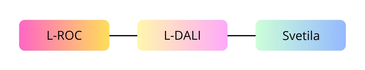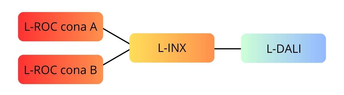 L‑DALI krmili scene, stalno osvetlitev in bere podatke iz D4i gonilnikov. L‑INX in LWEB izvajata urnike in poročila.