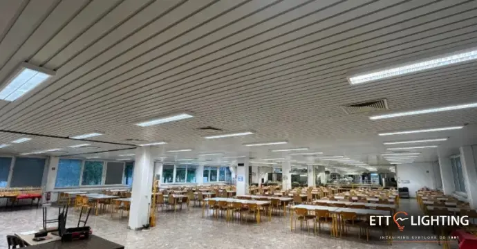 Posodobitev razsvetljave v jedilnici Cinkarne Celje z zamenjavo starih 2×58W fluo svetilk z LED svetilkami MONZA 41W.